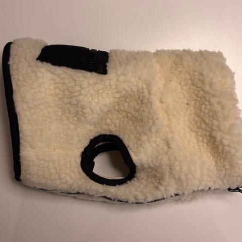 Ruskea koiran fleecetakki, jossa on lenkki kiinnitystä varten. Takki peittää koiran selän ja sivut, ja siinä on aukot eturaajoille. Materiaalina fleece, joka tarjoaa lämpöä ja mukavuutta. Käyttämätön. Sopii kleinspitz/mäyris kokoisille roduille.
