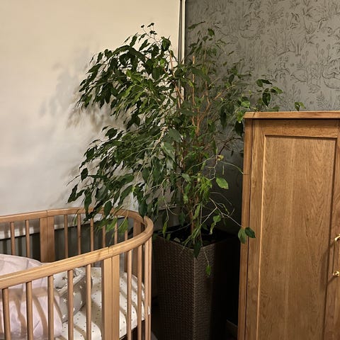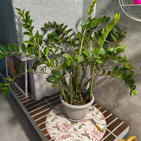Suuri vuoripalmu. Korkeus ruukun pohjasta korkeimpaan oksaan 137 cm, leveys 120 cm. Valkoinen ruukku kuuluu hintaan. Kiitollinen kasvi, ei juuri hoitoa tarvi, vettä vaan.