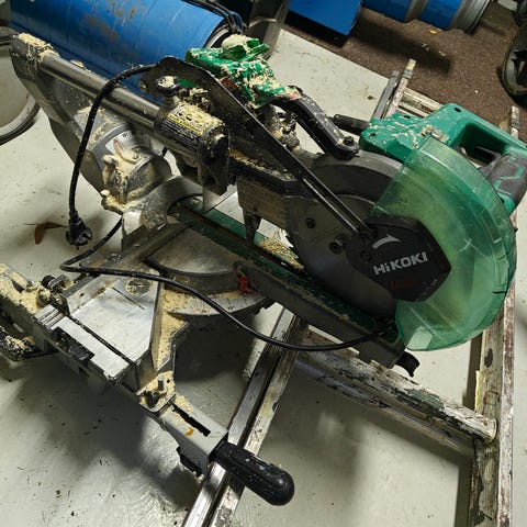Suoraan käytöstä Hikoki nauharuuvari ilman akkua. Kärjestä toinen muovi puuttuu, mutta käyttöä ei ole haitannut. Ei ole puhdistettu, vaan tosiaan käytöstä otettu, kun tilalle tuli toisen merkkinen.