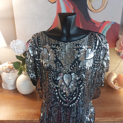Paljettikaulus pusero. Musta. Koko L-XL. Mustat paljetit kauluksessa edessä.
