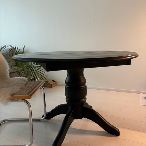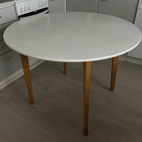 Jyskistä ostettu Kirkeby valkoinen ruokapöytä, halkaisija 110cm ja korkeus 75cm. Hyvässä kunnossa, pientä käytönjälkeä pinnassa (näkyy oikeastaan vain suorassa valossa) sekä yhdessä jalassa pieni kolhu (kuva).