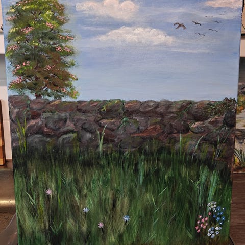 Maisemamaalaus, jossa merellinen tunnelma ja lintuja.