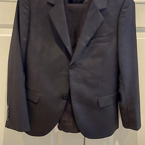 Ostan pojille mustat puvut koossa 128 ja 146 sekä mustat juhlakengät koossa n.32 ja 35.
