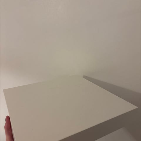 Elämää nähneet mutta edelleen täysin käyttökelpoiset musta ja valkoinen Lack-seinähylly. Valkoisessa hyllyssä on alapinnalla ja etureunassa muutama ylimääräinen ruuvinreikä.