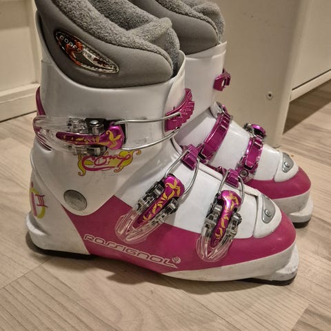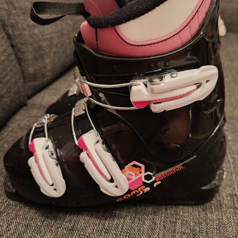 Rossignol laskettelumonot, koko 225 mm, vastaa kokoa 35-36, väriltään musta, valkoinen ja pinkki. Monot on käytetyt ja ulkoisesti näkyy kulutuksen jälkiä, kuten kuuluu. Ehjät ja toimivat.