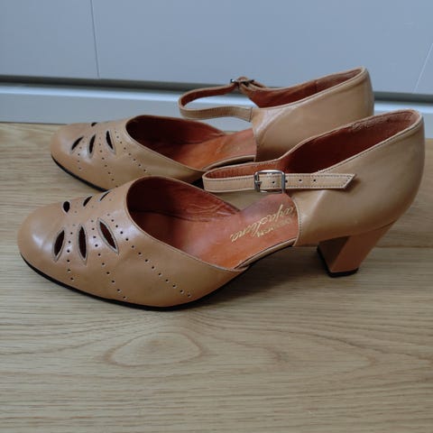 Sirot ja kevyet, käsintehdyt tanssikengät tamperelaiselta Elegant kenkätehtaalta. Kengät kokonaan nahkaiset, vasemmassa kengässä kaksi ohutta nahkaosaa rikki ja molempien kenkien kannat puhkikuluneet. Sinä kapeajalkainen kaunotar, korjaa tai korjauta nämä kengät pienellä vaivalla, ja varmasti saat huomiota näissä 60-luvun piikkareissa.