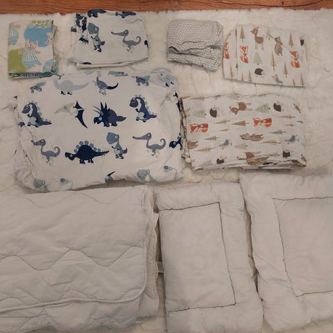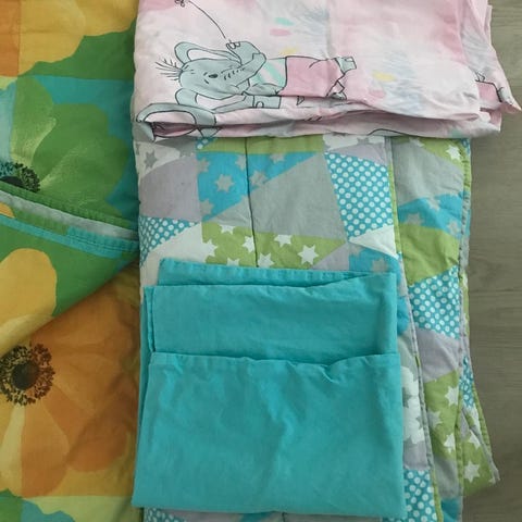 Junior kokoinen petivaatesetti: peitto (leveys 105cm, pituus 150cm), tyyny, kaksi pussilakanaa ja kolme tyynyliinaa. Hajusteeton koirakoti.