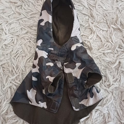 Mustan värinen koiran sadetakki, jossa on heijastinraidat. Takissa on lyhyet hihat. Käyttämätön. Sopii kleinspitz kokoisille koirille.