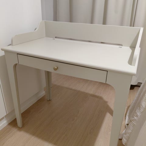 Ikean työpöytä, ehjä kaikin puolin ja laatikot toimii. Kansi on tosi kulunut ja vaatii päällystystä tai tehoputsausta. Kansi on kertaalleen päällystetty.