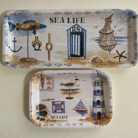Kaksi metallista, luonnonvalkoista, kauniisti koristeltua tarjotinta. 10€/setti