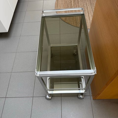 For sale: a stylish gold-colored serving trolley.