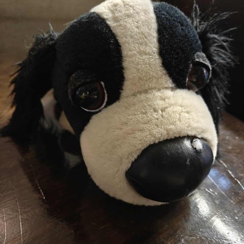 Pehmolelu koira valkoinen ja harmaa