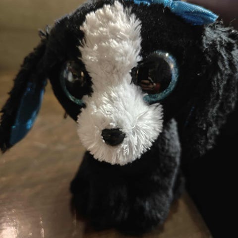 Pehmolelu koira, väriltään valkoinen ja harmaa. Sopii lasten leikkeihin ja koristeeksi.