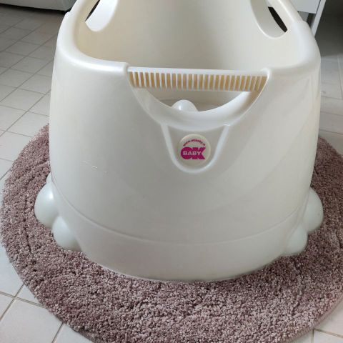 Mukana valkea kuppi, jossa reiät pohjassa. Lapset tykänneet sillä suihkutella päälleen vettä. Lisäksi irrotettavat liukuesteet.