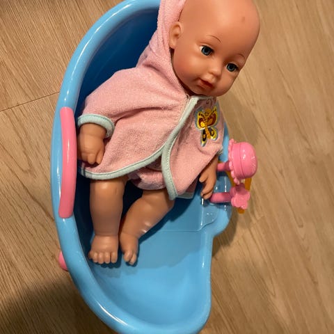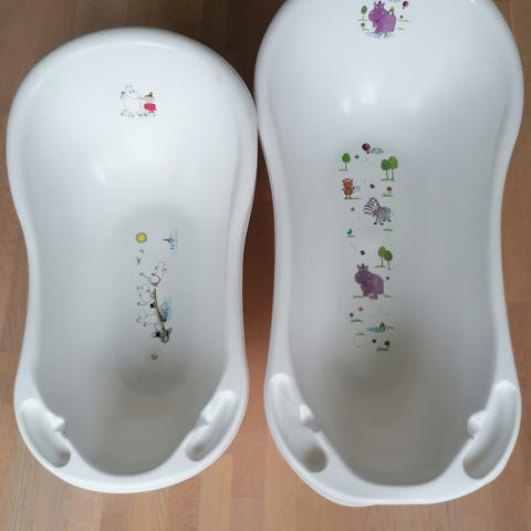 Sininen muotoiltu amme. Toisessa päässä kylvetetään pientä vauvaa, toisessa päässä istuu isompana. Kokonaispituus 95 cm, leveys 53 cm.