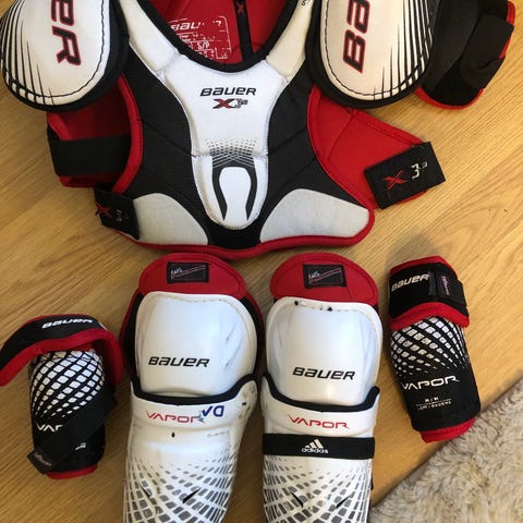 Aloituspakkaus nuorelle jääkiekkoilijalle. Pakkauksessa on hartiasuoja, kyynär- ja polvisuojat, jääkiekkohanskat ja jääkiekkohousut. Koko YTH S-L. Kaikki suojat ovat mukautettavissa, pidennettävissä tai levennettävissä, jotta suojia voi käyttää pitkään.