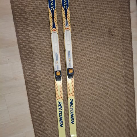 Peltonen lasten sukset, joissa sinivalkoiset siteet. Sukset soveltuvat lasten käyttöön ja niissä on säädettävät sinivalkoiset siteet.