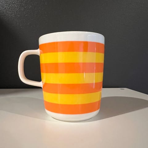 Myydään Marimekko Oiva ’Tasaraita’ -muki. Tilavuus 2,5dl. Vähän käytetty, hyvä kunto.