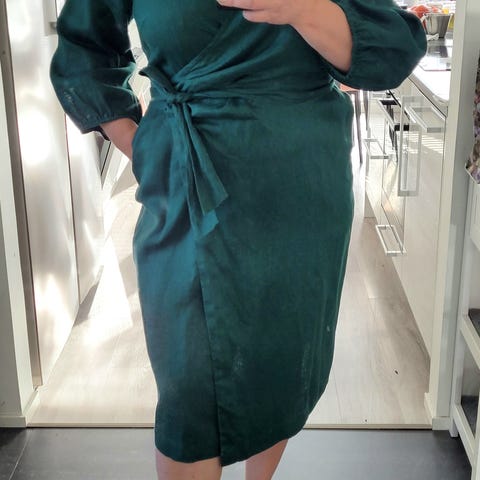 Linen handmade studio -merkkinen kietaisumekko. Valmistettu pellavasta, väriltään laventeli. Mekon koko on noin 44. Kai-kai noin 57cm, vyötärö noin 50cm (takana kuminauha), pituus noin 127cm.