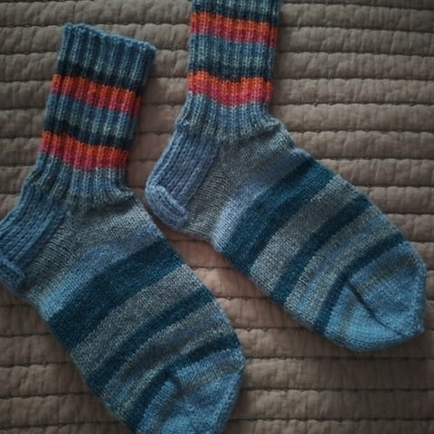 Uudet jämälankasukat . Kaikki langat konepestävää 7 - Veljeslangasta . Sisäpuolella ei lainkaan solmuja . Langat yhdistetty ohentamalla ja liittämällä yhteen .