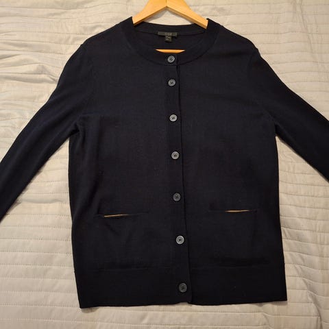 Erittäin kaunis malli, alaosa pliseerattu. Vajaamittaiset hihat. Edessä napitus. Napakkaa, hieman kiiltävää neulosta.