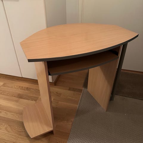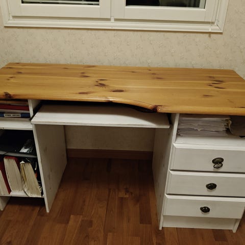 Puinen työpöytä, pari laatikkoa ja kaappia sekä näppäimistötaso. Työtason pinta vaatii hieman puhdistusta tai hiontaa. Pöytäosan korkeus 76cm