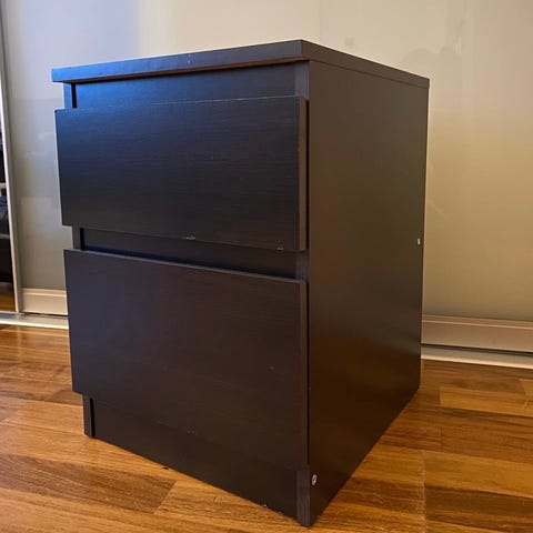 Siistikuntoinen yöpöytä kolmella laatikolla. Alla pyörät.