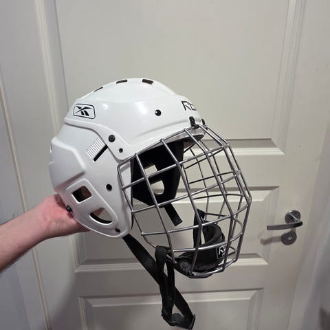 RBK jääkiekkokypärä valkoisella värillä. Kypärä on suunniteltu jääkiekon harrastamiseen ja tarjoaa suojaa pääalueelle. Sisäpuolella pehmusteet käyttömukavuutta ja turvallisuutta lisäämässä.