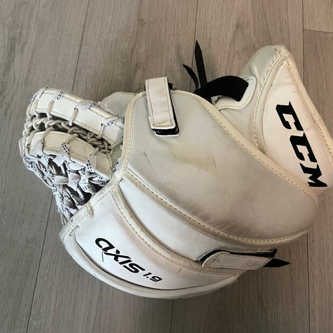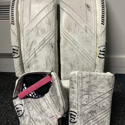 Kilpi: Warrior G4. Käytönjälkiä löytyy, mutta ei repeämiä tai reikiä. Kämmen on ehjä. Levyt vaikuttaa olevan ehjät. Tästäkään ei ole tullut u15 tai harrastekiekon vedot läpi.