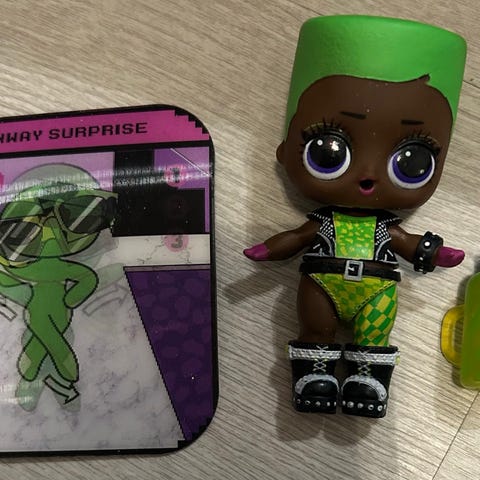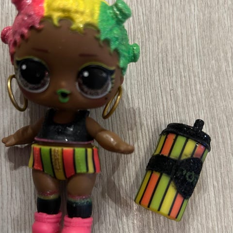 L.O.L. Surprise glitter nukke Jammin' Neon, jossa on värikkäät hiukset ja mukana kuvan varusteet. Nukella hieno värikäs asu ja kengät. Sopii lasten leikkeihin ja keräilyyn. Tämä kuuluu 12 erilaisen nuken keräilysarjaan. Huom. Myynnissä on kaksi samanlaista glitter nukkea. Hp. 9.00 euroa/tarjous.