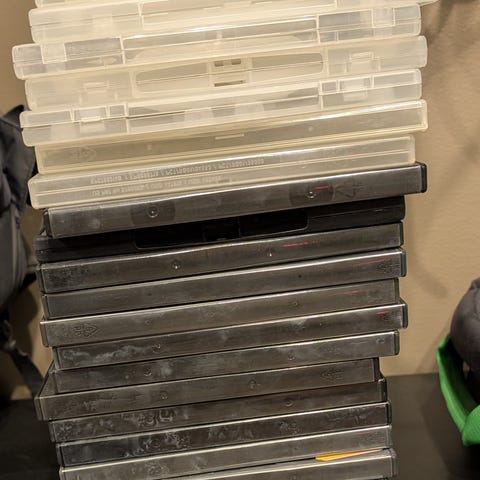 Annetaan laatikollinen tyhjiä DVD-koteloita.