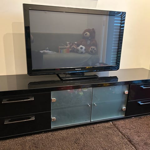 Ihan ok kuntoinen musta tv-taso myynnissä. Hieman naarmuja pinnalla, mutta täysin ehjä muuten. Vain nouto.