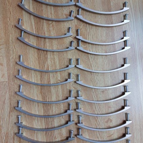 Messinkivetimet 31 kpl. Keittiöremontista jääneet, kertaalleen käytetty. Puustellin vetimet. Mitat pit. 106 Lev. 20 kork. 32 Ruuviväli 96 jalan paksuus 10 x 20. Koko setti ja ei lähetystä.