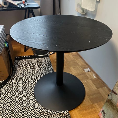Valkoinen pyöreä ruokapöytä, jossa käytön jälkiä pöytälevyssä (kuvat) .