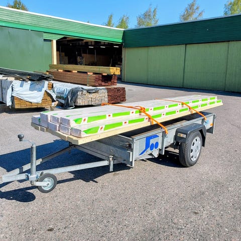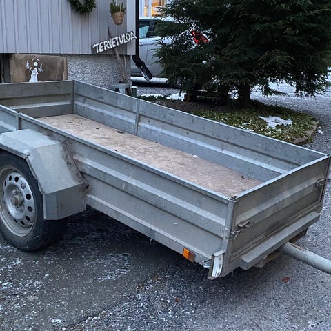 Lehtijousitettu näppärä pieni peräkärry. Lavan sisämitat: pituus 234cm ja leveys 124cm.