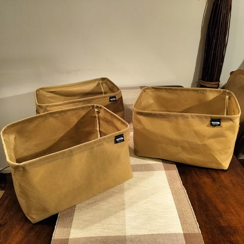 Kymmenen uudenveroista kangaskoria säilytykseen. Rivat päädyissä. 20x16 cm, korkeus 12 cm. 3€/2kpl