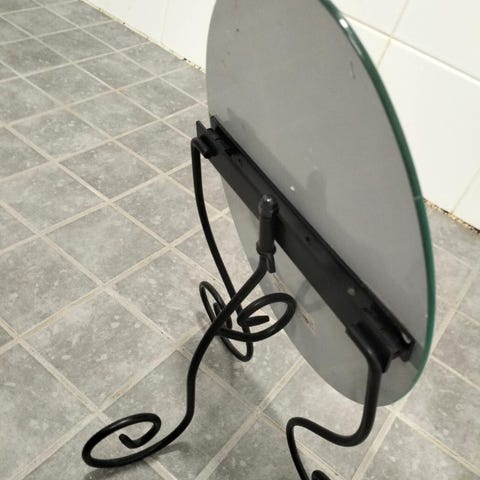 Peili kääntyy täysin moitteettomasti ympäri. Pieniä käytön jälkiä ja jotain likaa peilin reunoista saattaa löytyä.