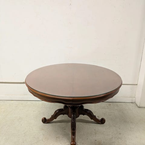 Tästä kompaktiinkin tilaan kaunis ruokapöytä! Kivat puukaiverrukset. Päällä pöydän muotoon leikattu lasi, minkä saa halutessaan irti. kunto on ihan hyvä käytetty kunto.