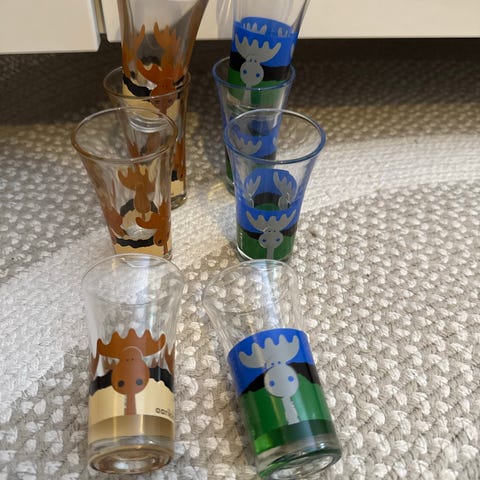 Aarikan hirven kuvalla kuvitettu snapsilasi (6cl). Lasin korkeus on 9cm. Lasit ovat ehjiä ja muutenkin hyväkuntoisia.