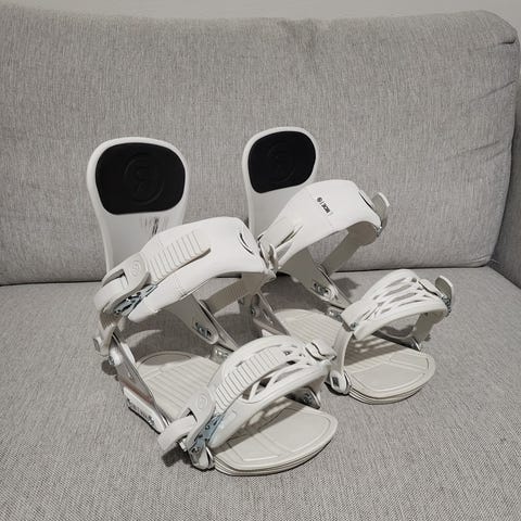 Ride Snowboardsiteet S-koko valkoisella ja mustalla värillä. Siteissä on säädettävät hihnat. Huomaathan, että siteet ovat kapeat, ks. mitat kuvista. Siteet kuvassa täyteen kokoon avattuna. Valmistajan mukaan 33,5-36,5, mutta vain kapeille monoille.