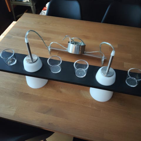 Hyväkuntoinen valaisin. Uusi sähköjohto ja kupu sokeripalaliitännällä. Korkeus n.12cm + metallinen kupu n.8 cm, leveys n.14cm. Postitus onnistuu. MMM.