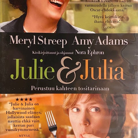 Julie & Julia -elokuva on tosi kertomus siitä, miten Julia Childin (Meryl Streep) elämä ja keittokirja inspiroivat vasta-alkavaa kirjailijaa Julie Powelia (Amy Adams) kokkaamaan 524 ruokareseptiä 365 päivässä. Kesto 1 tunti 58 min, tekstitys mm. suomi.
