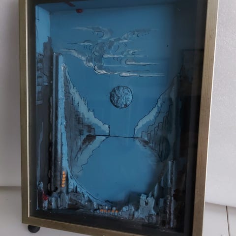 Teos on asetettu syvään lasitettuun kehykseen (shadow box), mikä tuo kolmiulotteisen vaikutelman