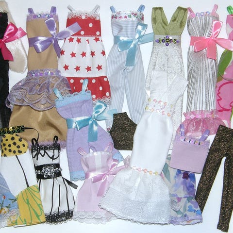 ( Hakusanoiksi: Barbi Steffi Barbie barbinukke barbin barbien vaatepaketti vaatteita mekko asut nukke muotinukke nukenvaatteet nuket leikki hääpuku häämekko iltapuku paljetit paljetti helmi helmet pitsi hopea satiini organza Marimekko Ratia laukku käsilaukku vyö kengät korkokengät )