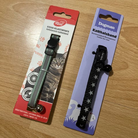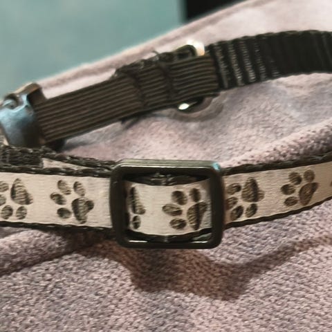 Säädettävä sininen kissan tai pienen koiran kaulapanta, jossa on metallinen renkaallinen kiinnitys.