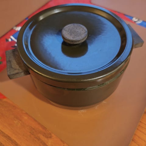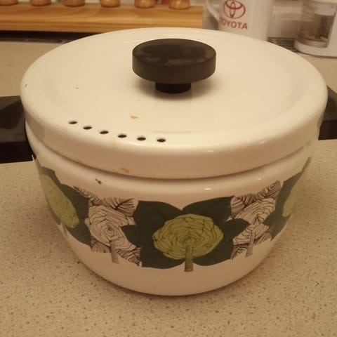 Kattila on emalia ja iso ja painaakin jonkin verran.