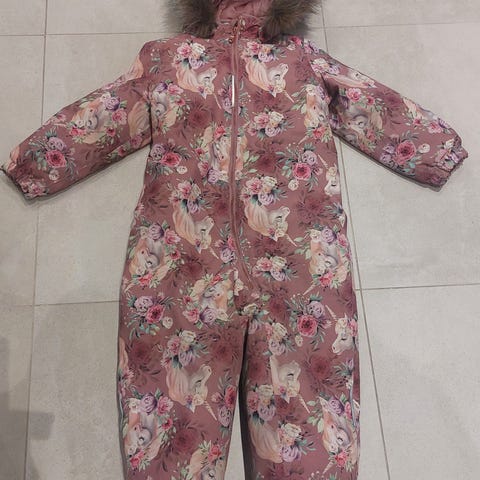 Paksu ja lämmin toppahaalari, yhden talven ollut käytössä. Pepussa ja polvissa hieman pehmentymää ja muutamia kivien tms. raapimia kohtia kankaan pinnassa.