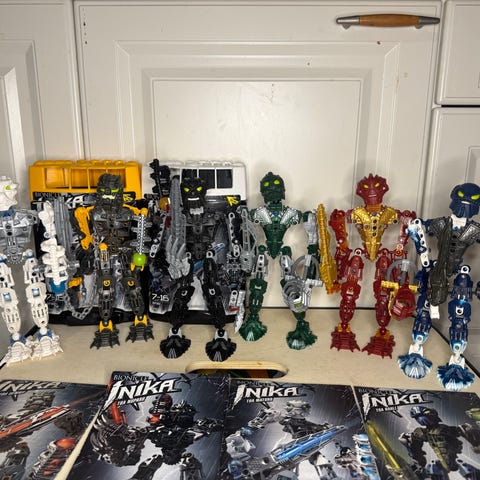 Bioniclen TOA sarjan hahmot 5 kpl, alkuperäispakkauksessa ohjeineen. Muistimme mukaan kerran rakennettu ja istuskelleet kirjahyllyssä ja purkeissa sen jälkeen. Myydään koko setti. 8531 Pohatu, 8532 Onua,8533 Gali, 8534 Gali, 8536 Kopaka,