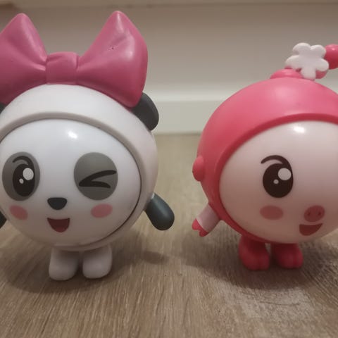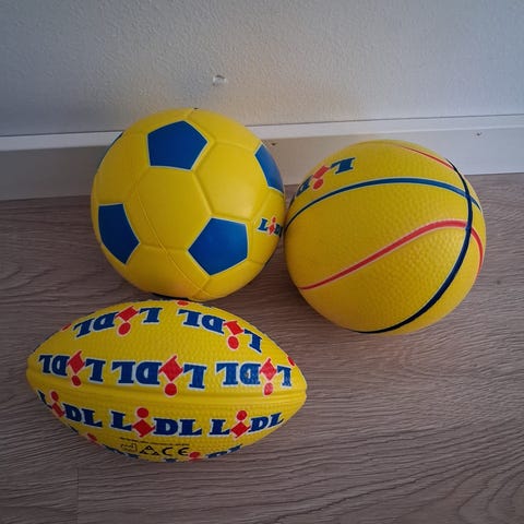 Tohon kuuluis sellanen vähän painavempi pallo, mut en löytäny sitä. Löysin tollasen lilan pallon, se on vähän turhan kevyt. Sille pitää antaa paljon vauhtia että se jaksaa kaataa keiloja.