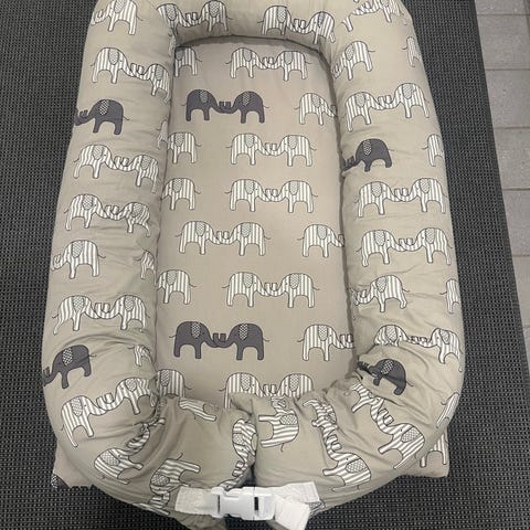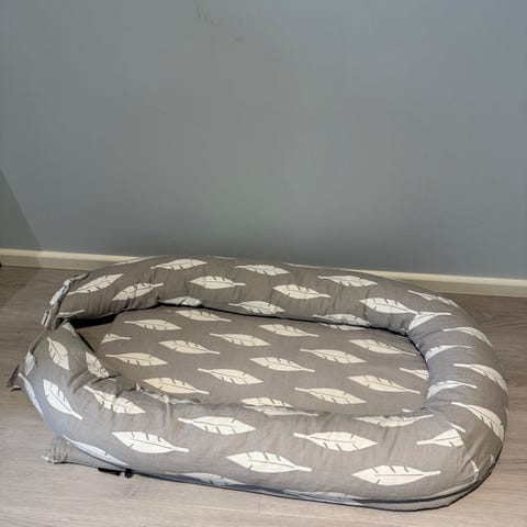 Emma merkkinen unipesä harmaalla sydänkuosisella kankaalla moiteettomassa kunnossa.